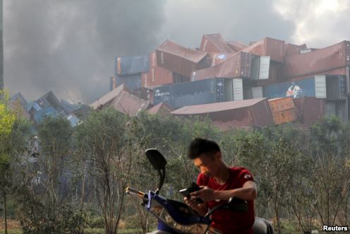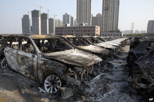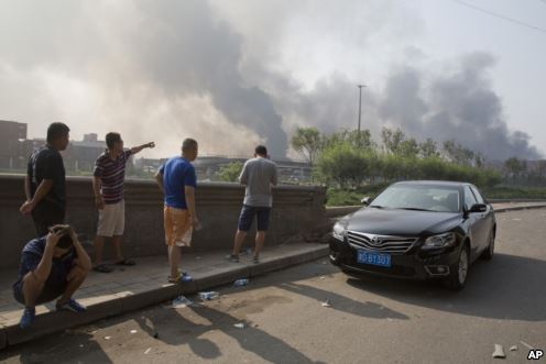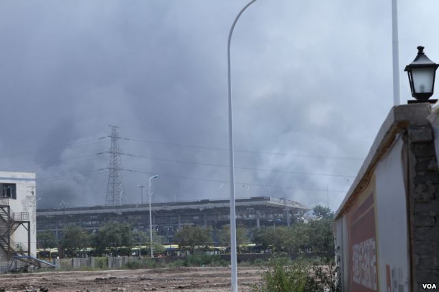 美国之音记者第一时间赶往天津爆炸事发地点,来到距离爆炸现场一公里左右地方,看到周围多座居民楼窗户被震碎,高速公路桥梁受损,多辆大货车被炸翻,小汽车起火。一位大卡车司机向美国之音记者讲述当时情况时,仍然余悸未消。